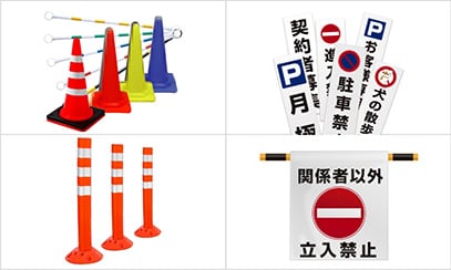 カラーコーンや駐車禁止ポール、駐車区画のライン引き等、駐車場の運営に欠かせない備品を取り揃えております。駐車場看板と合わせてお使いいただければ看板の効果を上げることができます。また、お手持ちのカラーコーンに貼るだけで、注意喚起や禁止表示、車の誘導や出入り口の案内ができるシールやパネルの他、コーンバーに垂らすことができる垂れ幕もご用意しています。