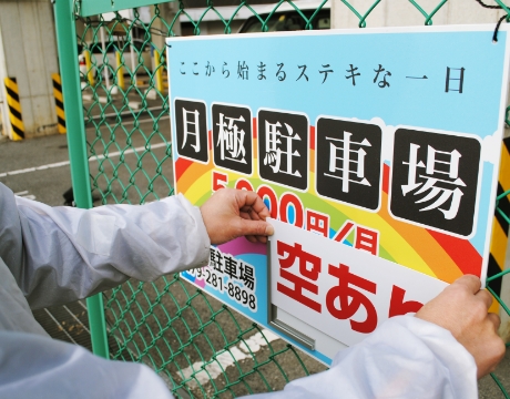 その他、ご契約者さまの名前を書いたネームプレートや区画の番号を入れたナンバープレートなども貸駐車場を運営する上では必須アイテムです。最近では表示面の大きな横断幕や、アイキャッチ効果のあるのぼり旗を使用して効果を上げている駐車場も増えてきています。